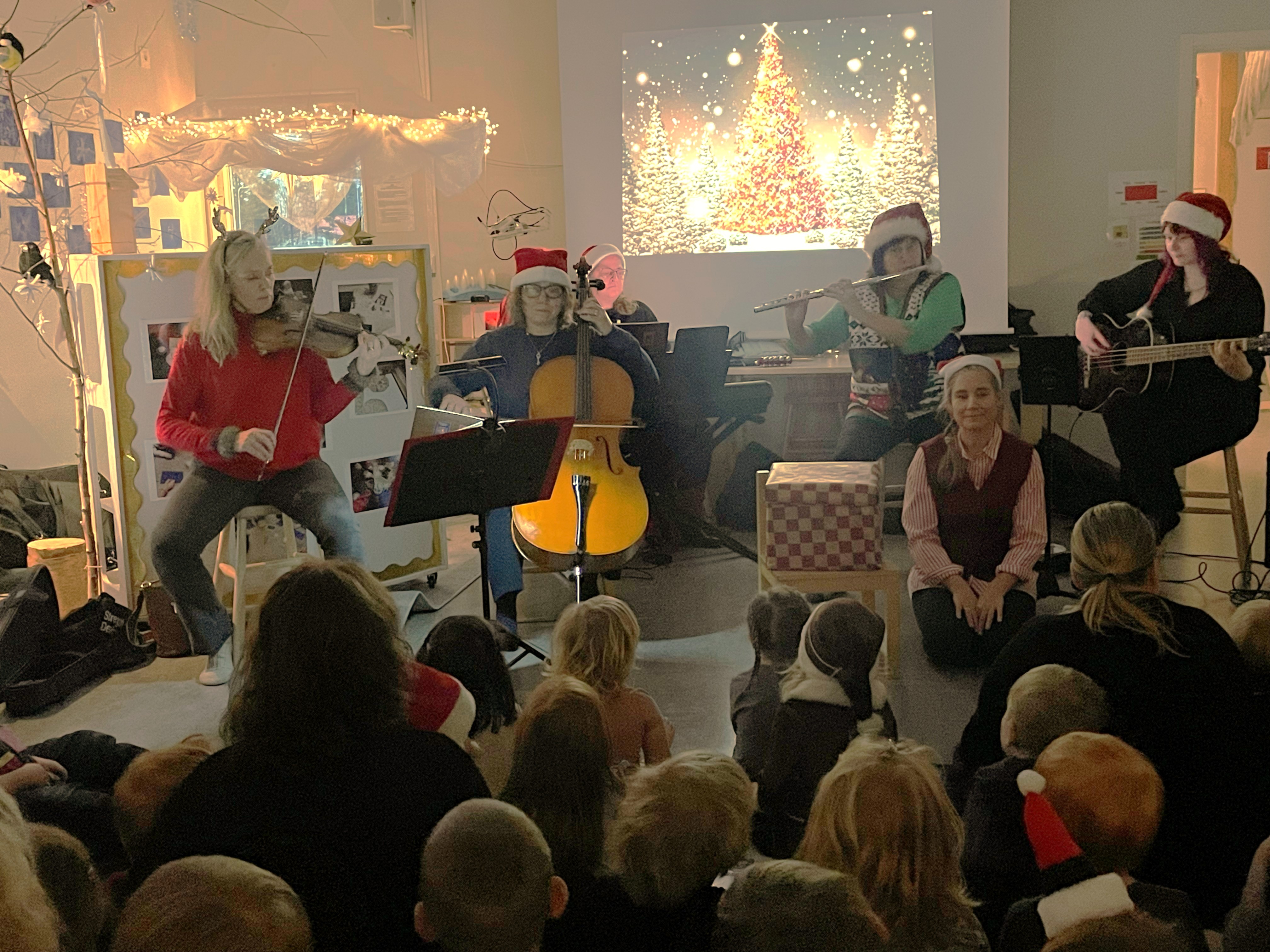 Ensemblen varierade under veckan med instrument som piano, trumpet, fiol, flöjt, cello och gitarr. Både barn och lärare sjöng och gjorde rörelser. En sockerbagare, I ett hus och blinka lilla stjärna var populära rörelselåtar. I repertoaren fanns också utrymme för barnen att välja en egen låt som de ville lära ut till musikerna. Ibland är en julklapp något så fint som att skapa musik ihop. En aktivitet som frigör dopamin, stärker hjärnan och ger glädje. God jul önskar Kulturskolan.