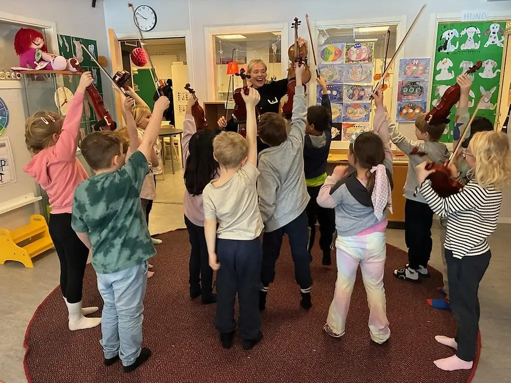 Förstora bildenBarnen i förskoleklass ihop med fiolfröken Ulla