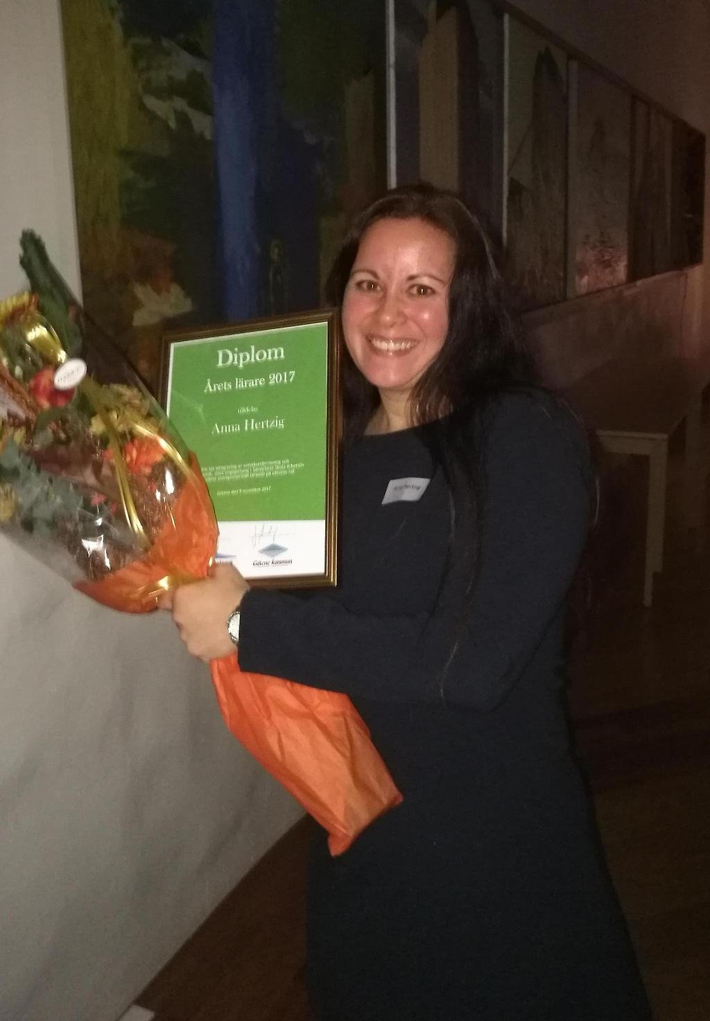 På den åliga näringslivsgalan som var igår den 9 oktober utsågs Anna Hertzig till årets lärare. Juryns motivering var ”För sin integrering av svenskundervisning och industribesök, stort engagemang i Samarbete Skola Arbetsliv och konkret entreprenöriellt lärande på elevens val.”