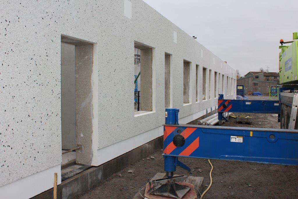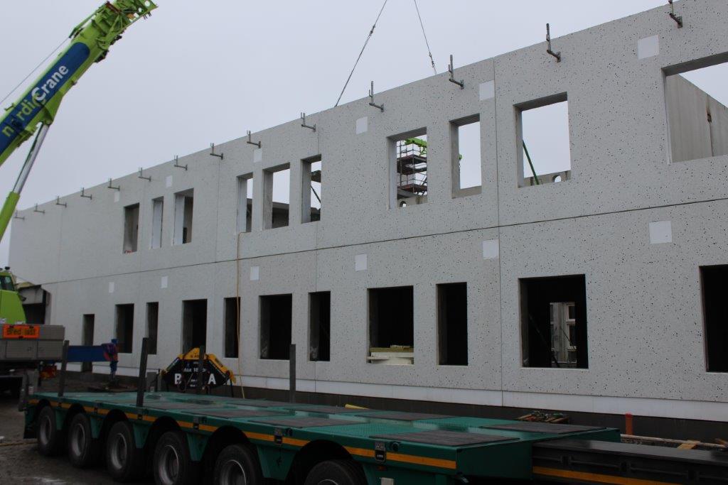 Förstora bildenFasadelement på plan två lyfts på plats. Klicka på bilden för att förstora.