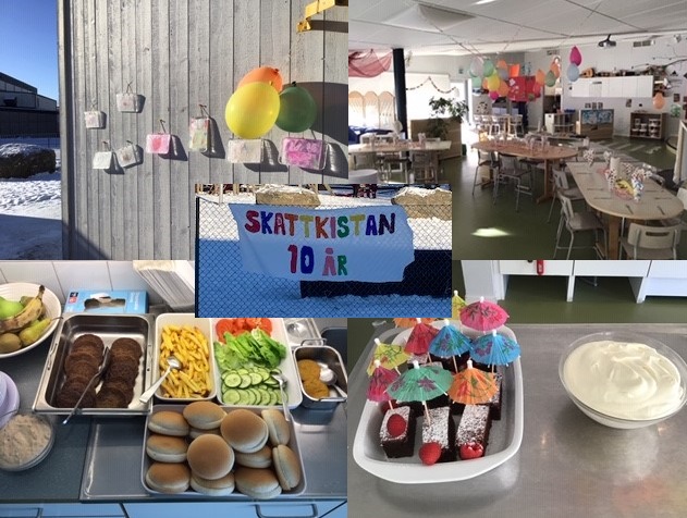Den 8 februari var det stort kalas och firande av förskolan Skattkistan. Verksamheten har nu varit igång i 10 år. Barnen och pedagogerna hade tillsammans dekorerat både invändigt och utvändigt för att uppmärksamma denna dag. Självklart bjöds det extra god lunch och fika. Verksamheten har skickat med en text om hur dom själva upplevde både dagen för 10 år sedan och festdagen tillsammans med barnen.