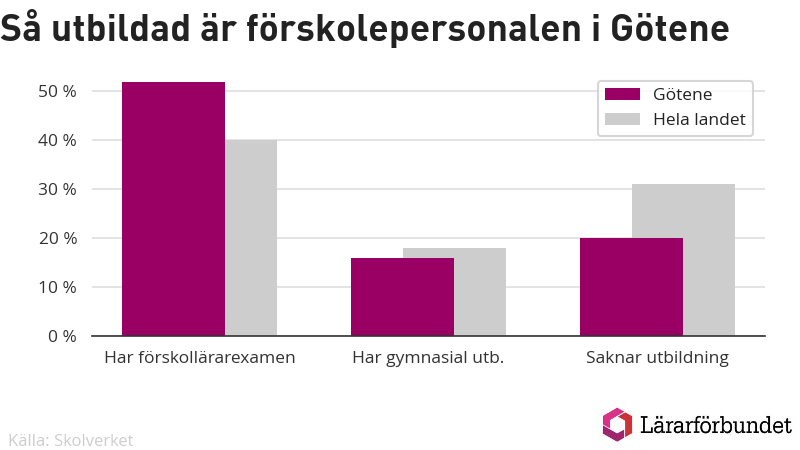 Under 2019 hade 52 procent av personalen i förskolan Götene förskollärarexamen. Det är betydligt fler än i riket som helhet (40 procent).