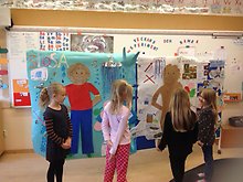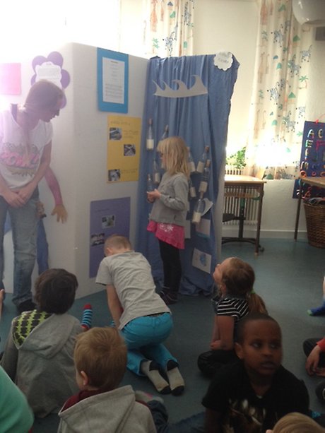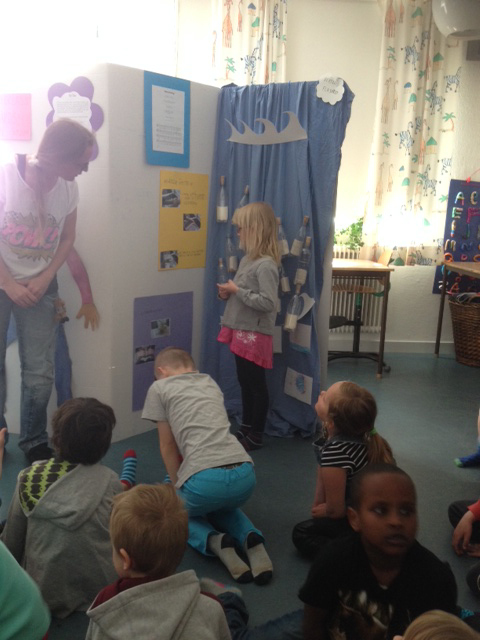 Förstora bildenEleverna på Prästgårdsskolan visar på olika sätt hur man kan spara vatten. Längst till höger syns den flaskpost med spartips som eleverna gjort.