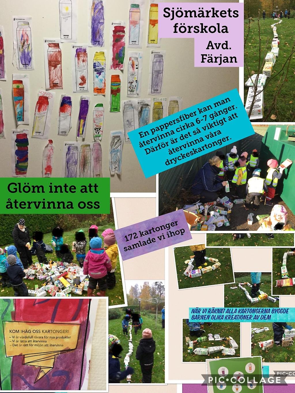 Avslutningsvis vill barn och personal på Sjömärket uppmana alla att återvinna dryckeskartonger. För visste ni att en pappersfiber kan återvinnas upp till 7 gånger! Bra, va? Ta hand om Miljön, Låt den va´ Grön!