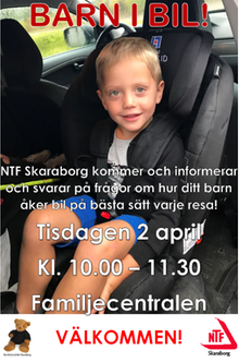 Tisdagen den 2 april mellan klockan 10-11.30 kommer NTF Skaraborg till Familjecentralen. De kommer att informera och svara på frågor om hur ditt barn åker bil på bästa sätt. Välkomna!