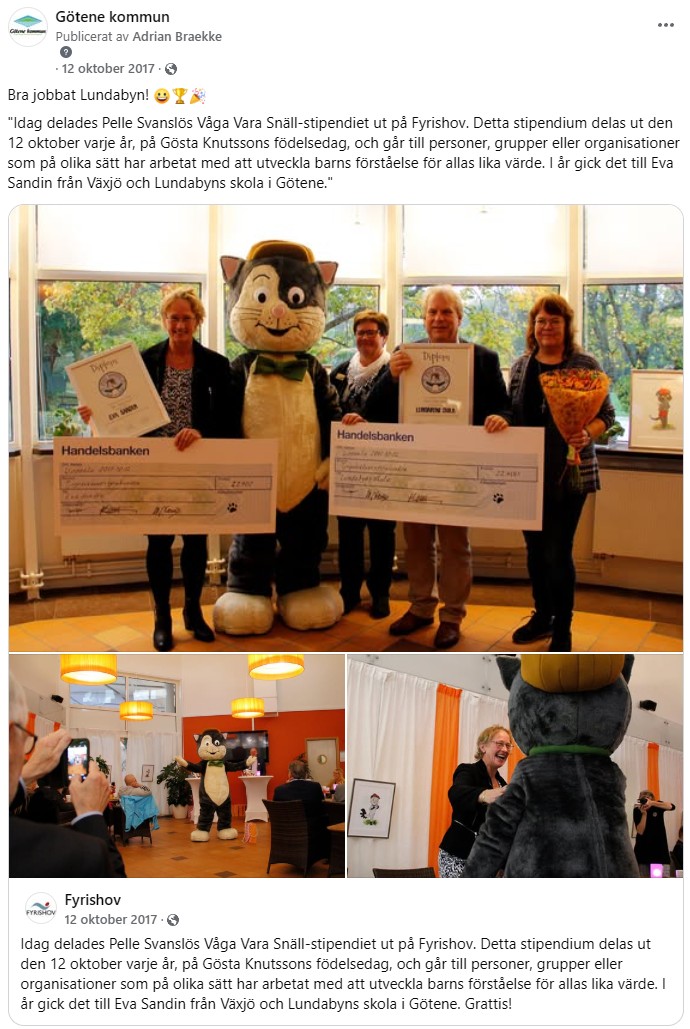 I torsdags den 12 oktober delades Pelle Svanslös Våga Vara Snäll-stipendium ut. Kriterier för att få det är att man på något sätt har arbetat med att utveckla barns förståelse för allas lika värde. Lundabyn var en av två som fick stipendiet och rektor Bengt-Åke Gindemo var på plats för representera skolan.
