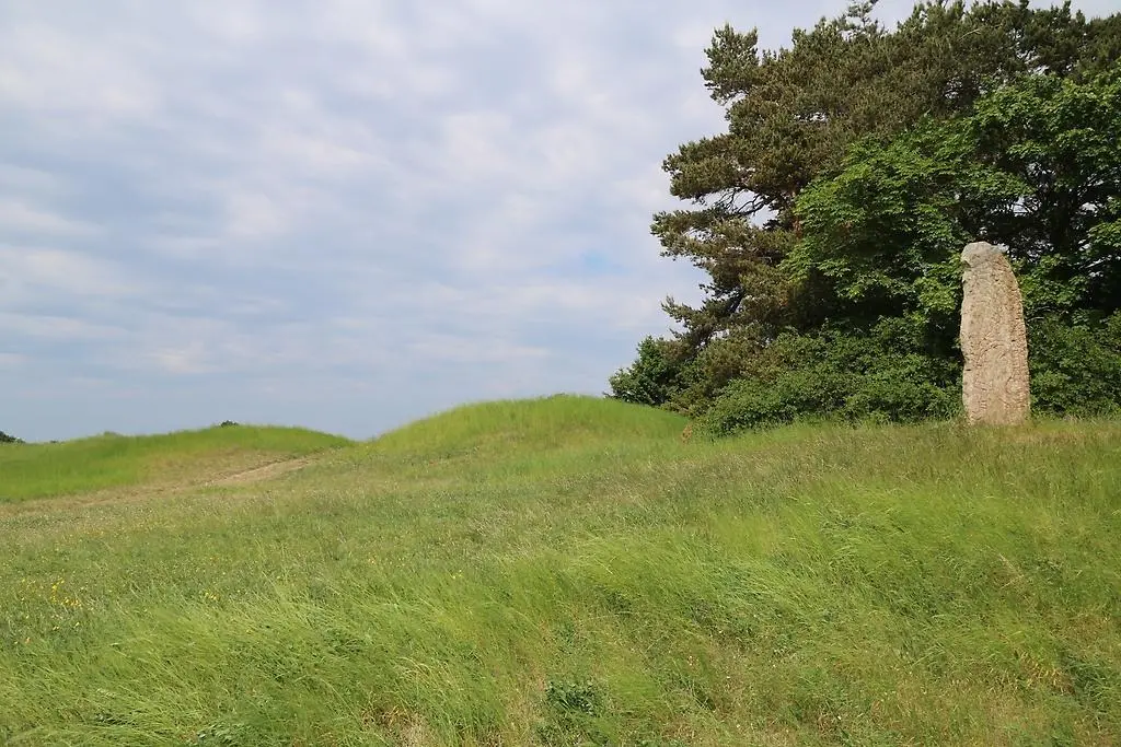 Förstora bildenDen mindre av de två stora runstenarna, med gravfältet vid Källby hallar i bakgrunden.