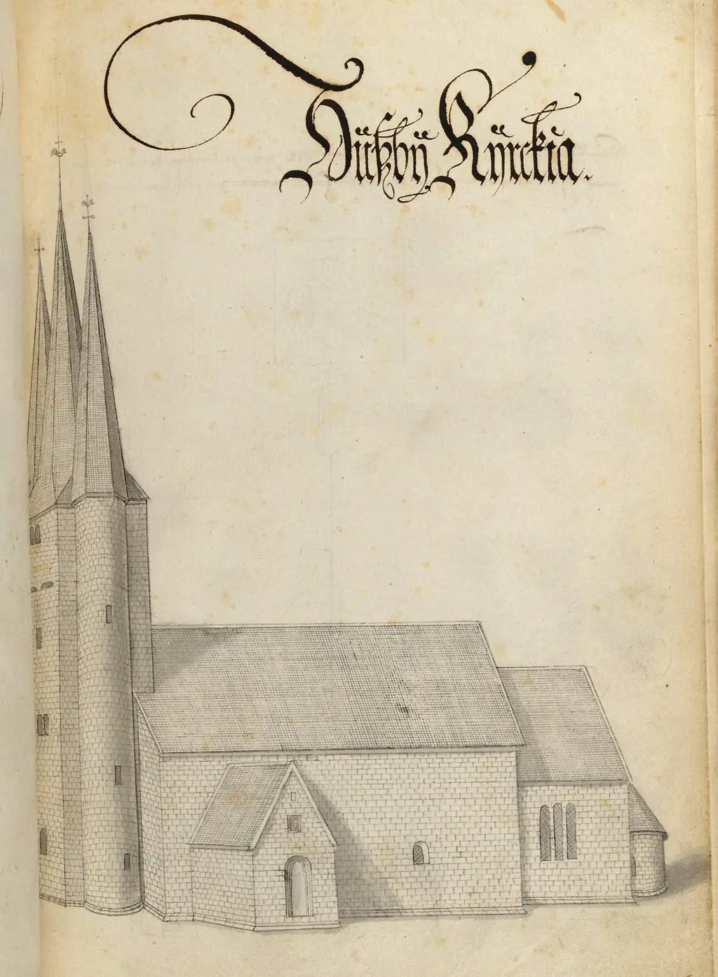 Förstora bildenHusaby kyrka avbildad av Johan Peringskiölds Monumenta Sveo-Gothorum, omkring 1670.