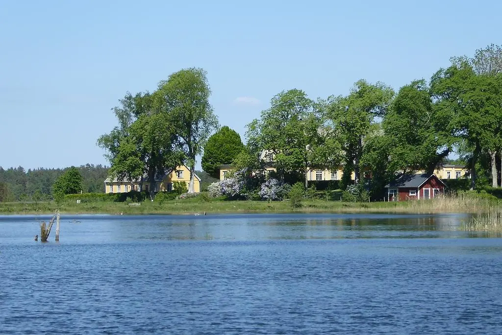 Förstora bildenÅrnäs säteri sett från hamnen. Den stora huvudbyggnaden från 1790 skymtar mellan träden. Till vänster och höger om denna ligger envånings flygelbyggnader.
