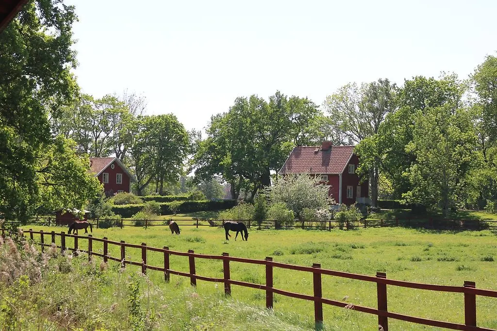 Förstora bildenTvå av arbetarbostäderna i områdets södra del. Runt husen finns säteriets välhävdade åker- och hagmark med höga storväxta ekar och andra lövträd.