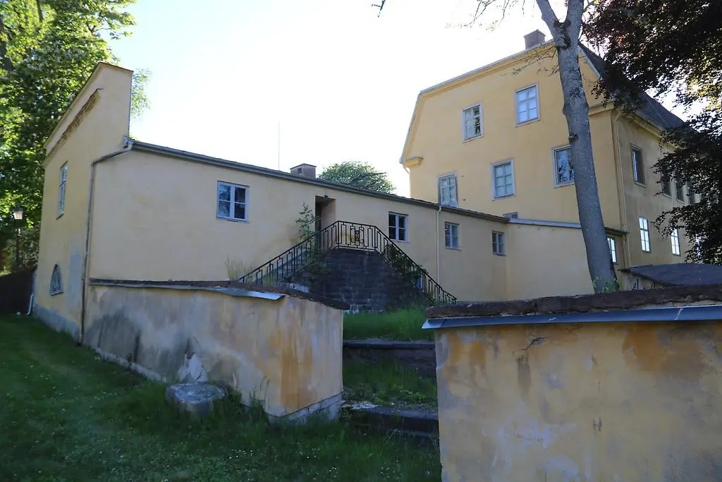Förstora bildenHönsäters herrgård. Huvudbyggnadens östra gavel och flygelbyggnad sedd från Hönsätersvägen.