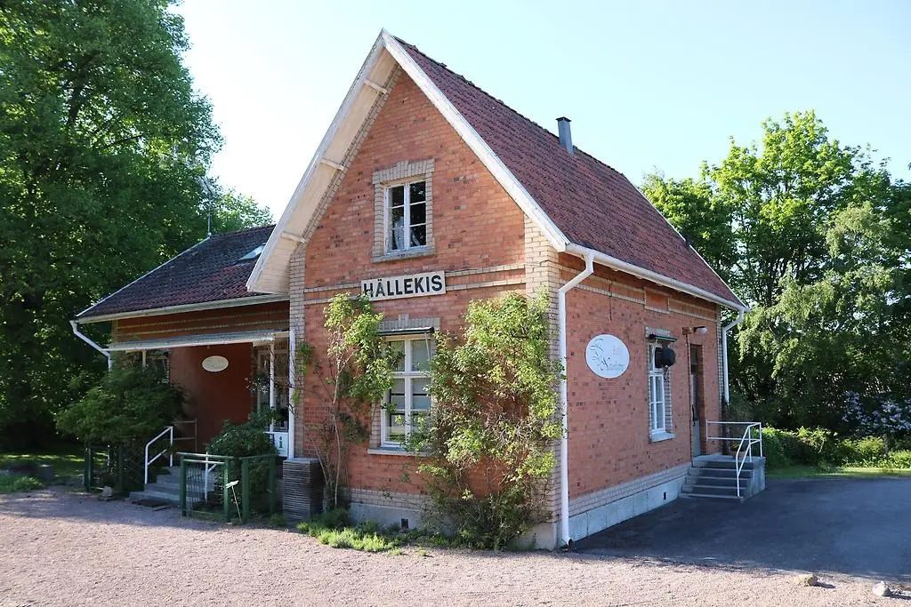Förstora bildenStationshuset i Hällekis uppfört 1897 i lokalproducerat tegel 1897. Delen med gavel mot banan som stationsnamnskylten sitter på är en tillbyggnad från cirka 1920. I och med att stationen öppnades kom samhällets namn att ändras till Hällekis eftersom det ansågs att ortens tidigare namn Hönsäter kunde förväxlas med Högsäter i Dalsland.