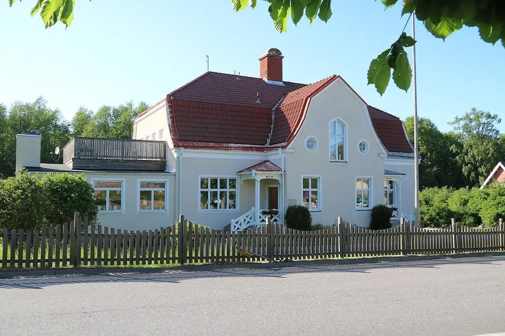 Förstora bildenHönsäter 5:17. Den tidigare hushållsskolan som senare blev matbespisning för brukets ungkarlar, en verksamhet som fortsatte in på 1970-talet. Byggnaden uppfördes 1912 men då utan den låga tillbyggnaden till vänster i bilden. Fasaden var ursprungligen av tegel och inte putsad som idag. Inte heller fönstren är ursprungliga. Trots ombyggnader och tillägg är byggnaden värdefull med sin historiska koppling till cementbolaget och samhällets framväxt.