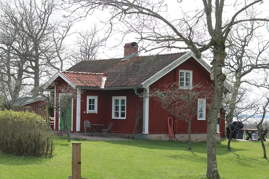 Förstora bildenTrolmen 14:1. Ett av de två arbetarbostäderna med det gemensamma namnet ”Klippan”. I vartdera huset bodde två familjer med gemensam farstu och bakugn i mitten. Farstun har nyligen byggts till men i övrigt är byggnaden exteriört välbevarad med stengrund, faluröd träpanel och enkupigt taktegel. I bakgrunden skymtar Vänern nedanför klevkanten.