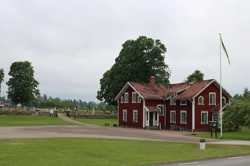 Förstora bildenHolmestads nedre skola som ligger bredvid begravningsplatsen söder om vägen, på fastigheten Holmestad 7:1.