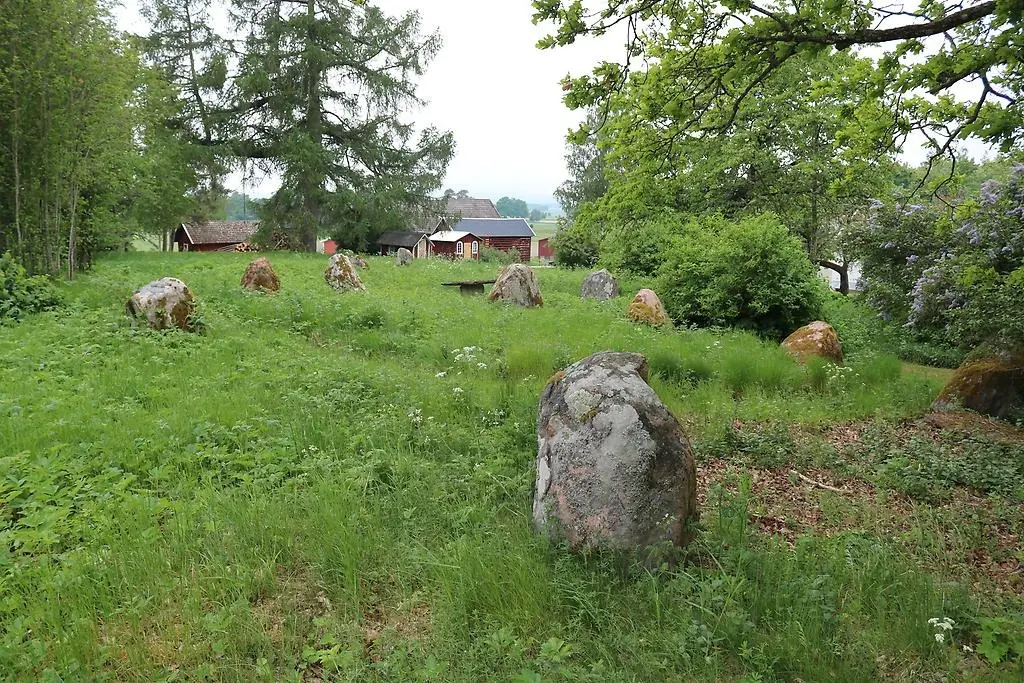 - Gravfält med domarringar och resta stenar norr om kyrkan.