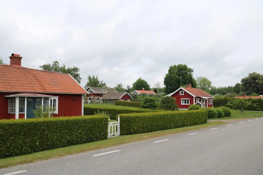 Förstora bildenDen småskaliga torpbebyggelsen längs vägen genom byn.
