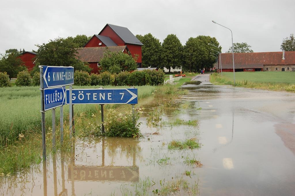 Förstora bildenÖversvämning vid en vägskylt mot Götene.