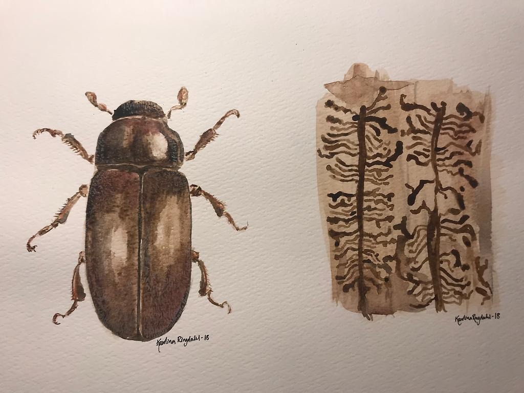 Förstora bildenIllustration av granbarkborre samt gnagda gångar. K. Ringdahl. Klicka på bilden för att förstora.