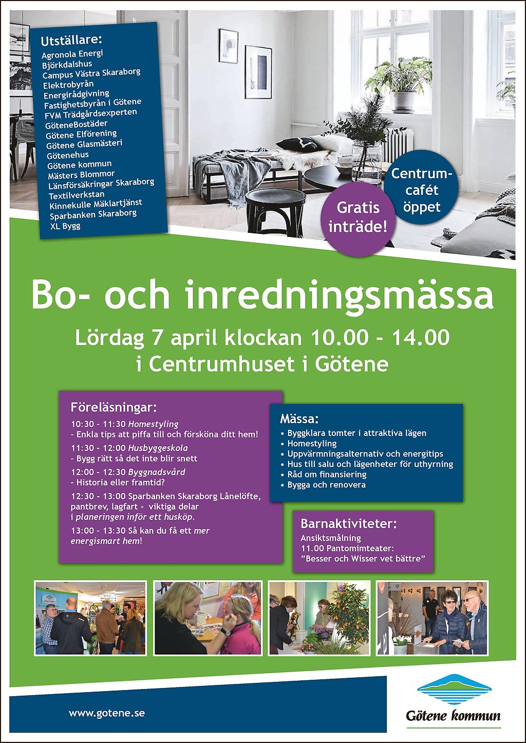 Bo- och Inredningsmässan äger rum lördagen den 7 april 2018 klockan 10.00-14.00 i Centrumhuset, Götene. En populär mässa för företag, organisationer i bygga-, bo- och inredningsbranschen.