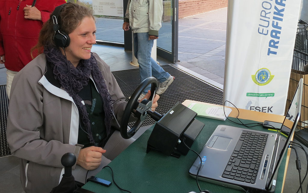 Några tappra vågade sig på simulation och fick en snabbkurs hur man ska tänka när man kör Ecodriving.