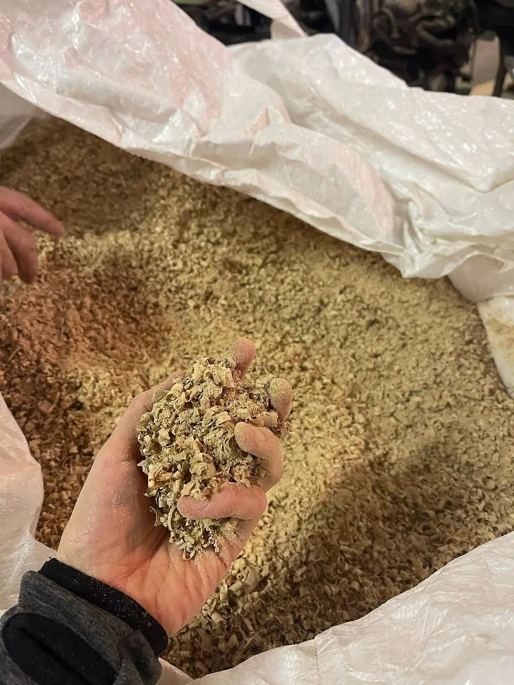 Förstora bildenSäckar med hyvelspån från ekarna.