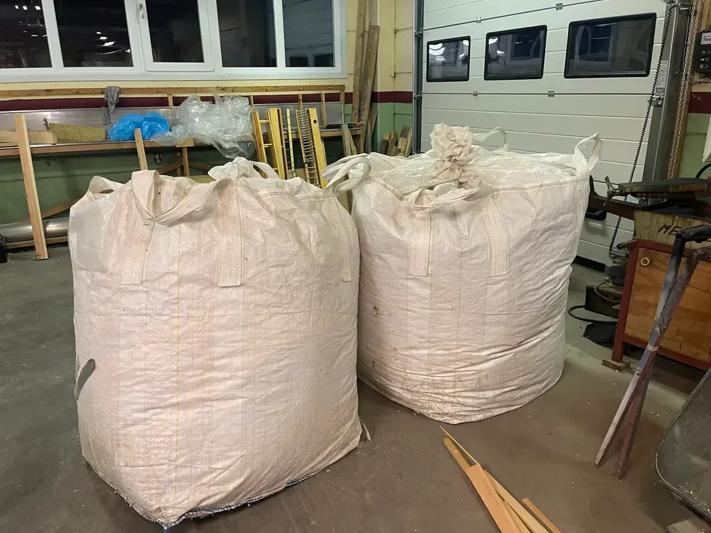 Förstora bildenBåde hyvelspån och finare sågspån från ekarna samlas upp i stora säckar.