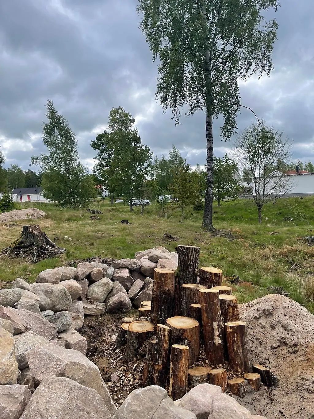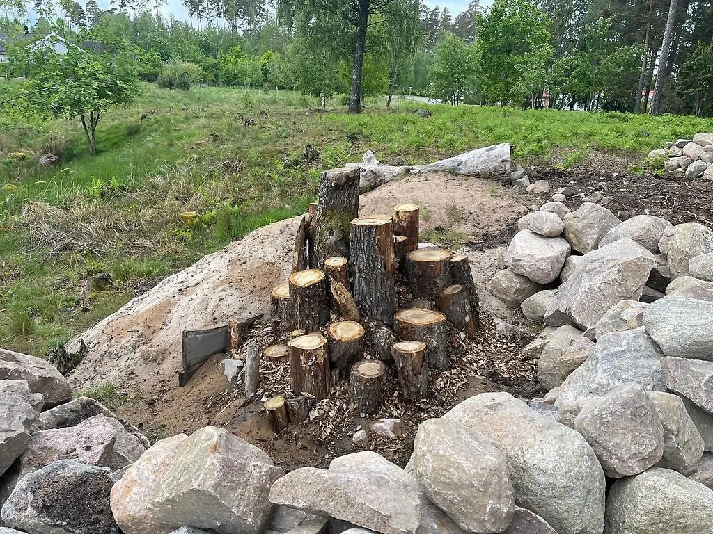 Förstora bildenEkoxkompost som omringas av stenmur och sandbädd för att gynna pollinerare, beteshage i Nordskog Källby.