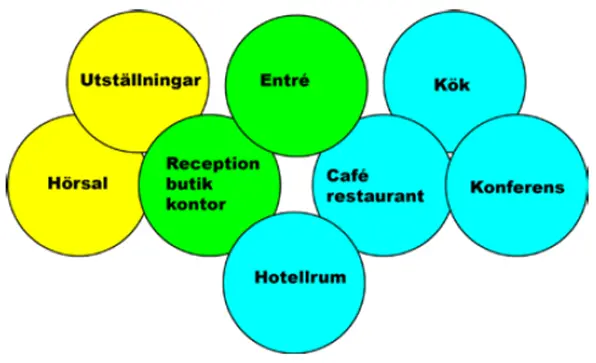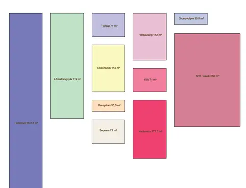 Totalt 1600 kvm. Till detta kommer ytor för kommunikation samt teknik, eventuellt spa och eventuell reningsanläggning. Omfattningen beror på planlösningar och vald teknik men kan landa på cirka 25%. Den sammanlagda ytan blir då 2000 kvadratmeter. En schematisk uppställning av hur olika funktioner kan samverka visar hur naturumets ytor (i gult) och hotellets ytor (i blått) kan relatera till varandra. Gemensamma ytor i grönt.