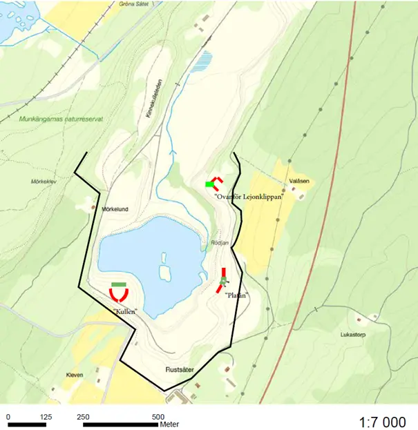 Kartbilden visar lokaliseringsstudiens föreslagna lokalisering vilket är Stenbrottet Kinnekulle. Förslaget har tre olika placeringar och därtill principskisser med utgångspunkt i det framtagna rumsprogrammet på föregående sida. Den norra placeringen som också är den som förordas är också likvärdig med den som föreslås i den fördjupade översiktsplanen för Kinnekulle.