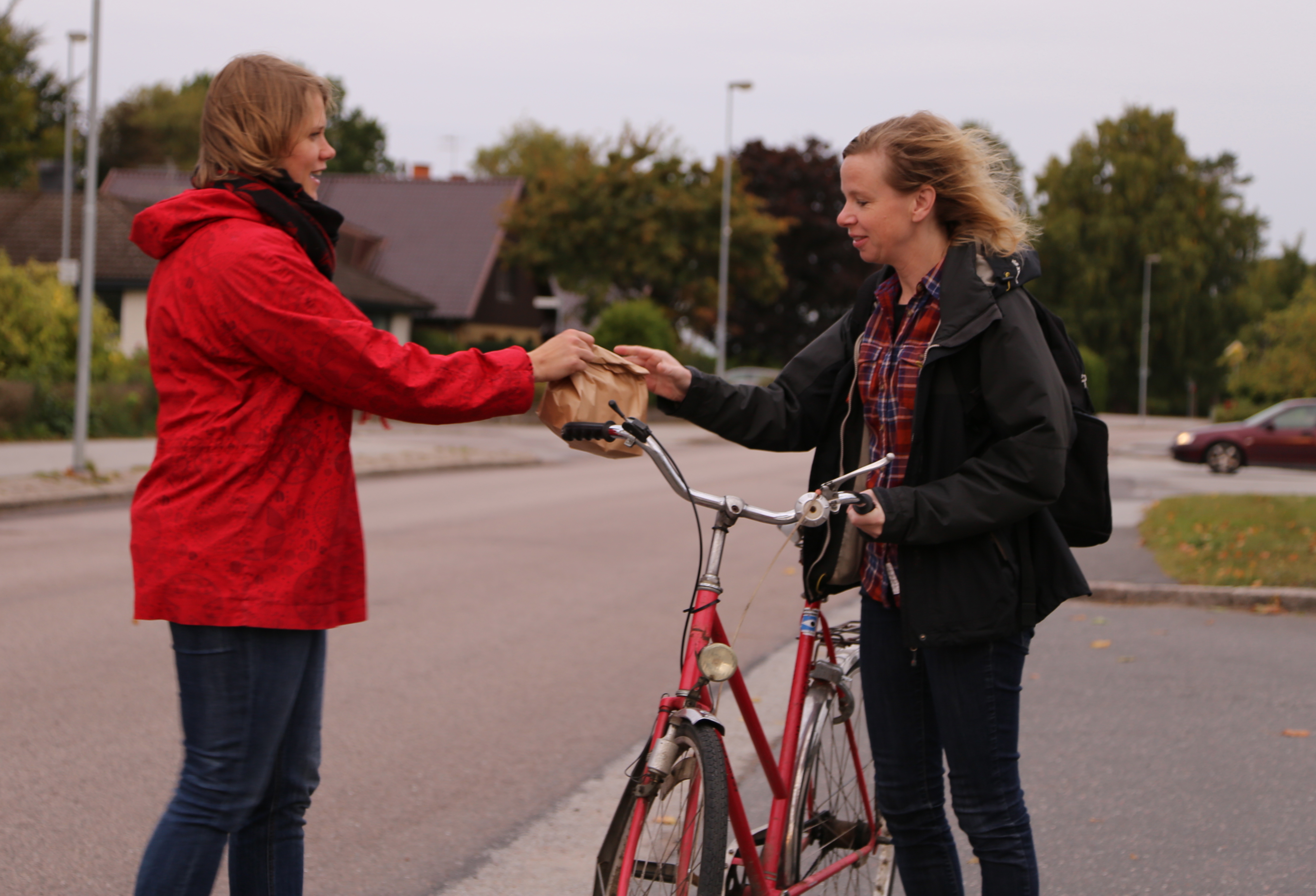 I korsningen Lidköpingsvägen och Västerbyvägen står kommunens klimat- och energirådgivare Sara Sandling och delar ut frukostpaket till alla cyklister och gångare. Hon står där fram till klockan 8.30.