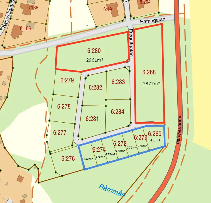 - Sju fastigheter, Götene Källby 6:269-6:275, blå markering, som lämpar sig för kedjehus i äganderättsform, om totalt ca 2 900 kvadratmeter.