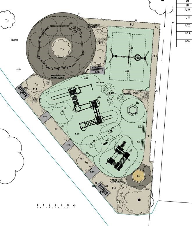 Lekplatsen består av fyra områden med en stor lekställning för dom lite större barnen, en lekställning för de lite mindre barnen samt en gungställning med kompisgunga och en stor hinderbana med balanslek. Utöver det kommer det även finnas sandlåda, trampolin, lekkullar, gungdjur med mera. Lekplatsen kommer ramas in med en plantering, träd samt ha belysning och sittbänkar.