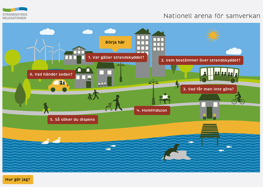 Den interaktiva webbutbildningen tar 20-30 minuter att gå igenom. Användaren klickar sig fram genom olika avsnitt som berättar om reglerna, vem som bestämmer, vilka villkor som gäller för att dispens ska beviljas och hur man bär sig åt om man vill vidta en åtgärd på strandskyddat område.