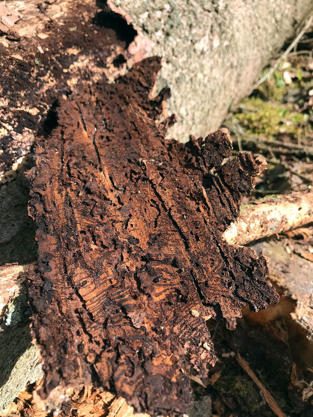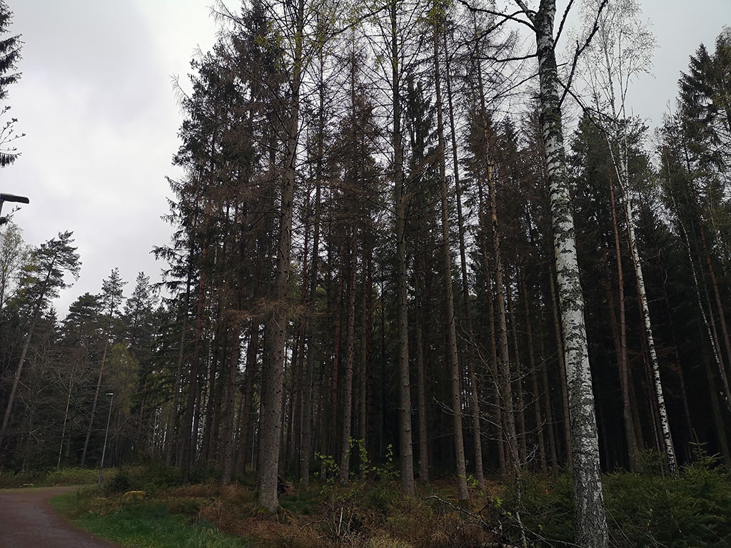 Tyvärr har vi även i år angrepp av granbarkborre i Brännaskogen och Stjälkaskogen. Med hjälp av hundar tränade för sökning av granbarkborre vet vi nu vilka träd som är angripna. Över 150 träd markerades som angripna i Brännaskogen.
