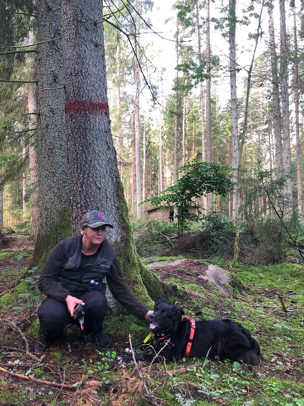 Förstora bildenCamilla Lundgren från Baggebo hundcenter och hunden Tara framför ett nymarkerat angripet träd.