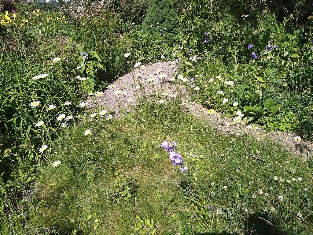 Den vilda ängen blir en del av rabatten och trädgården. En grusad gång bjuder in besökare att njuta av mångfalden.