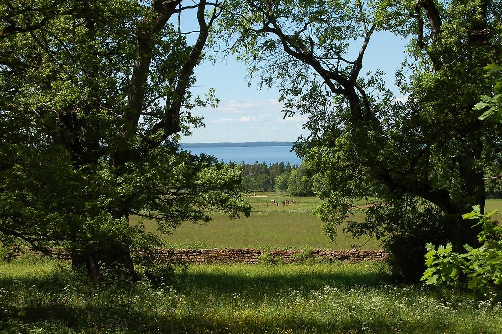 Utsikt mellan träd över ängsmarker, skog och Vänern.