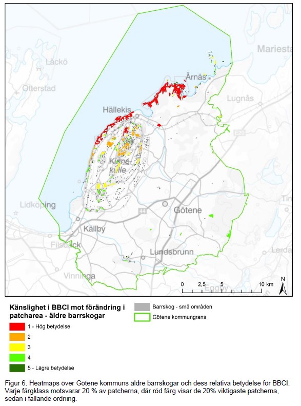 Förstora bildenHeatmaps över Götene kommuns äldre barrskogar och dess relativa betydelse för BBCI. Varje färgklass motsvarar 20 % av patcherna, där röd färg visar de 20% viktigaste patcherna, sedan i fallande ordning.