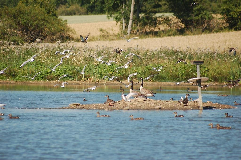 En mängd fåglar som stannat till för att vila vid sjön, klicka för att förstora.