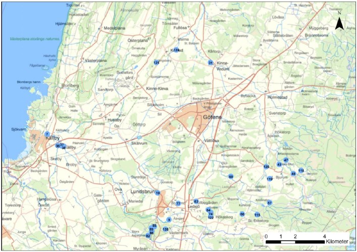 Förstora bildenÖversiktskarta som visar de 30 prioriterade lägena i Götene kommun.