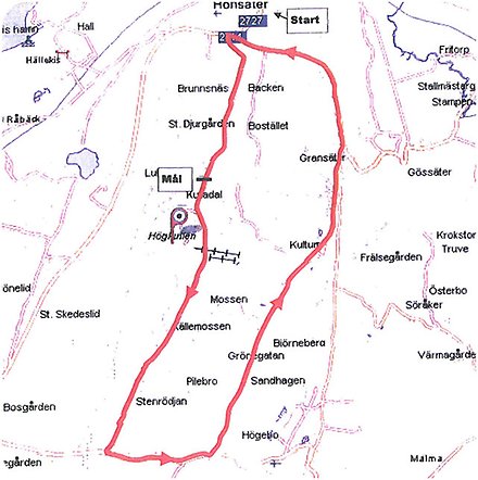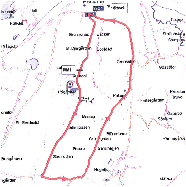 Bana: Enskild väg över Högkullen, vänster mot Högebo (2722), vid Högebo vänster mot Gransäter (2723), Gransäter Hällekis (2714)