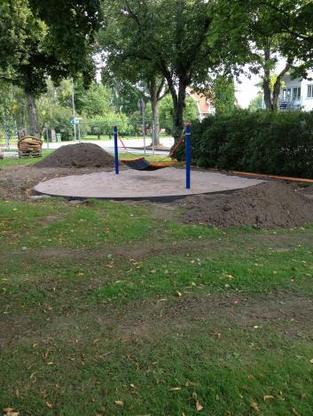 Gatuavdelningen på Service och teknik ansvarar för bygget av den nya lekplatsen. Grundarbetet är klart och lekutrustningen är på plats Nu ska det gjutas gummimattor runt alla lekutrustningar. En del av växtplanteringarna kommer att få vänta till våren nästa år.