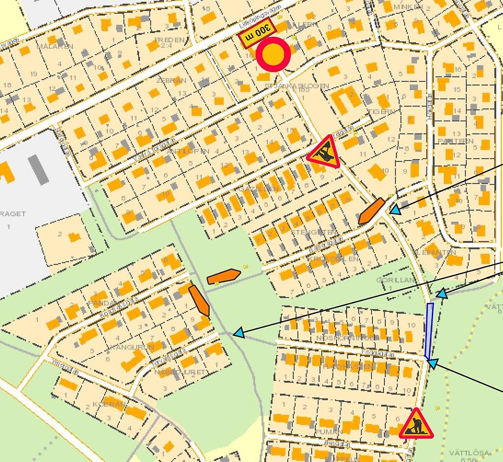 Gående och cyklister från Duvgatan kan välja att använda Brännaskogens elljusspår för att passera eller följa vägvisningspilarna via Baldergatan.