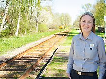 Förstora bildenLokföraren Sofia Lundborg vid station Trolmen. Foto: Anna Hållams. Klicka på bilden för att förstora.