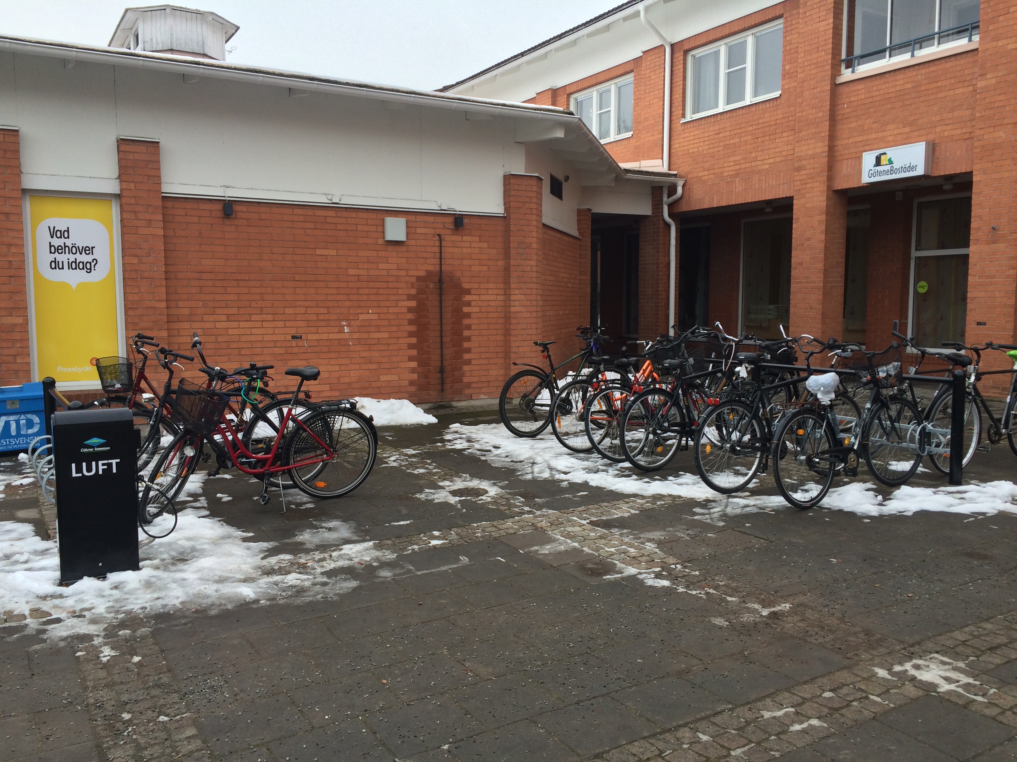 Service & Teknik har bytt ut cykelstället vid Pressbyrån. Samtidigt har en cykelpump satts upp.