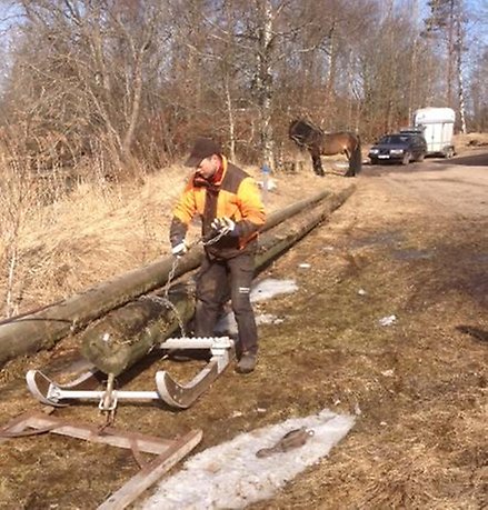 Arbetet med att bygga en ny bro på Sjöråsleden har börjat. Med hjälp av en häst har timmer till broarna dragits fram.