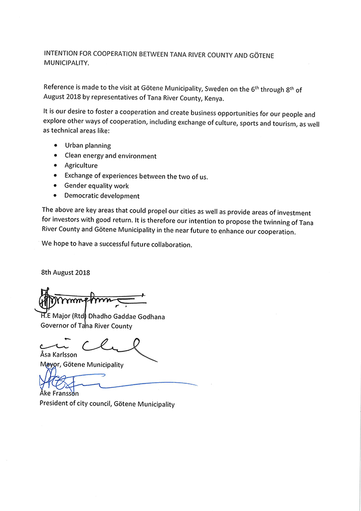 Avsiktsförklaringen mellan Götene kommun och Tana River County. Klicka på bilden för att förstora.