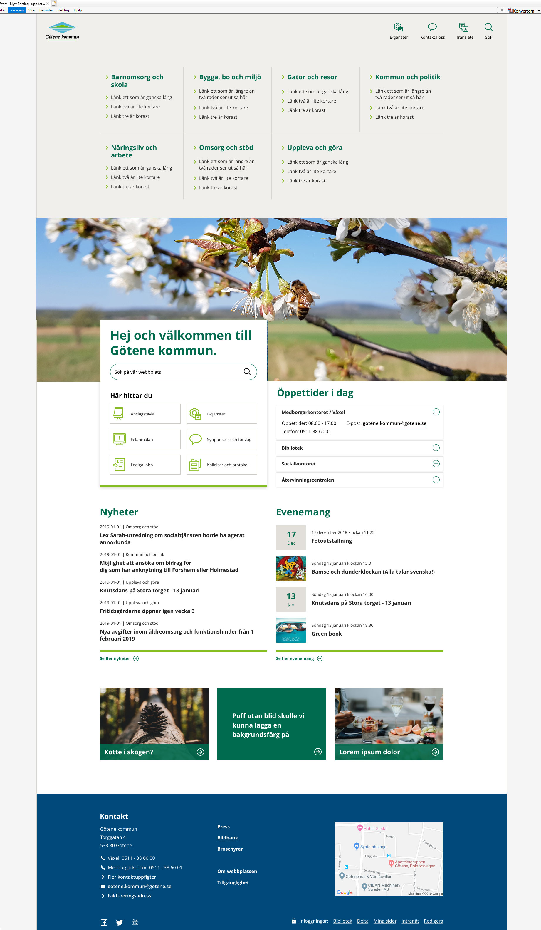 Sidfoten som finns på alla sidor kommer att innehålla kontaktuppgifter, länkar till sidor som ligger utanför vår huvudmeny samt karta och inloggningslänkar till de system som våra besökare är i behov av.