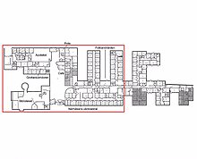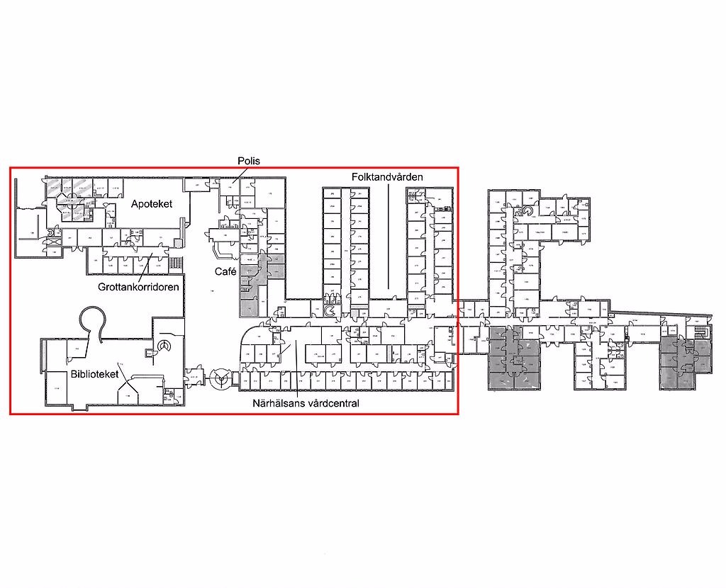 Förstora bildenCentrumhuset plan 1, de berörda delarna är rödmarkerade. Klicka på bilden för att förstora.